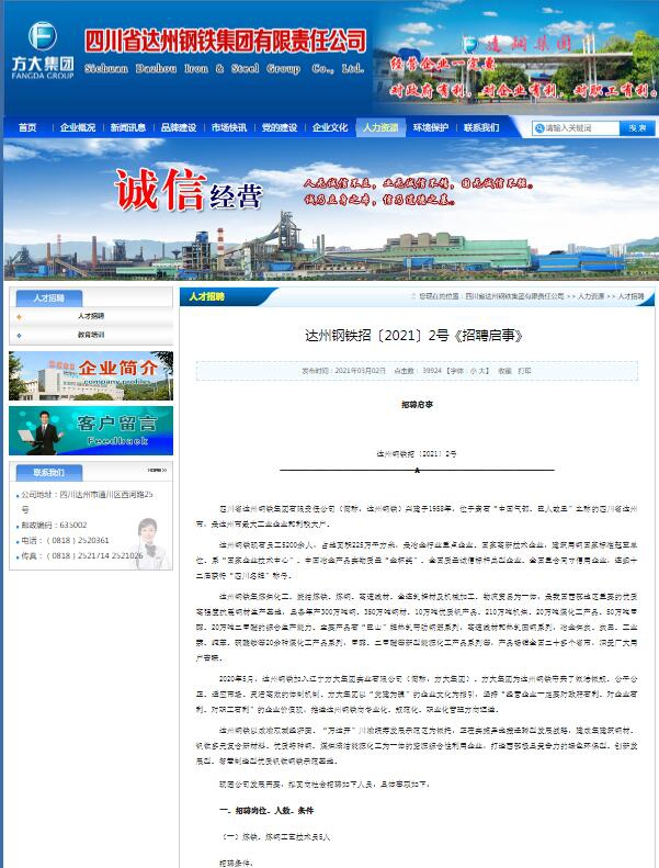 達(dá)聘網(wǎng)(www.0818rc.net)達(dá)州人才網(wǎng)訊,四川省達(dá)州鋼鐵集團(tuán)有限責(zé)任公司(簡(jiǎn)稱:達(dá)州鋼鐵)興建于1958年,位于素有“中國氣都、巴人故里”之稱的四川省達(dá)州市,是達(dá)州市最大工業(yè)企業(yè)和利稅大戶。