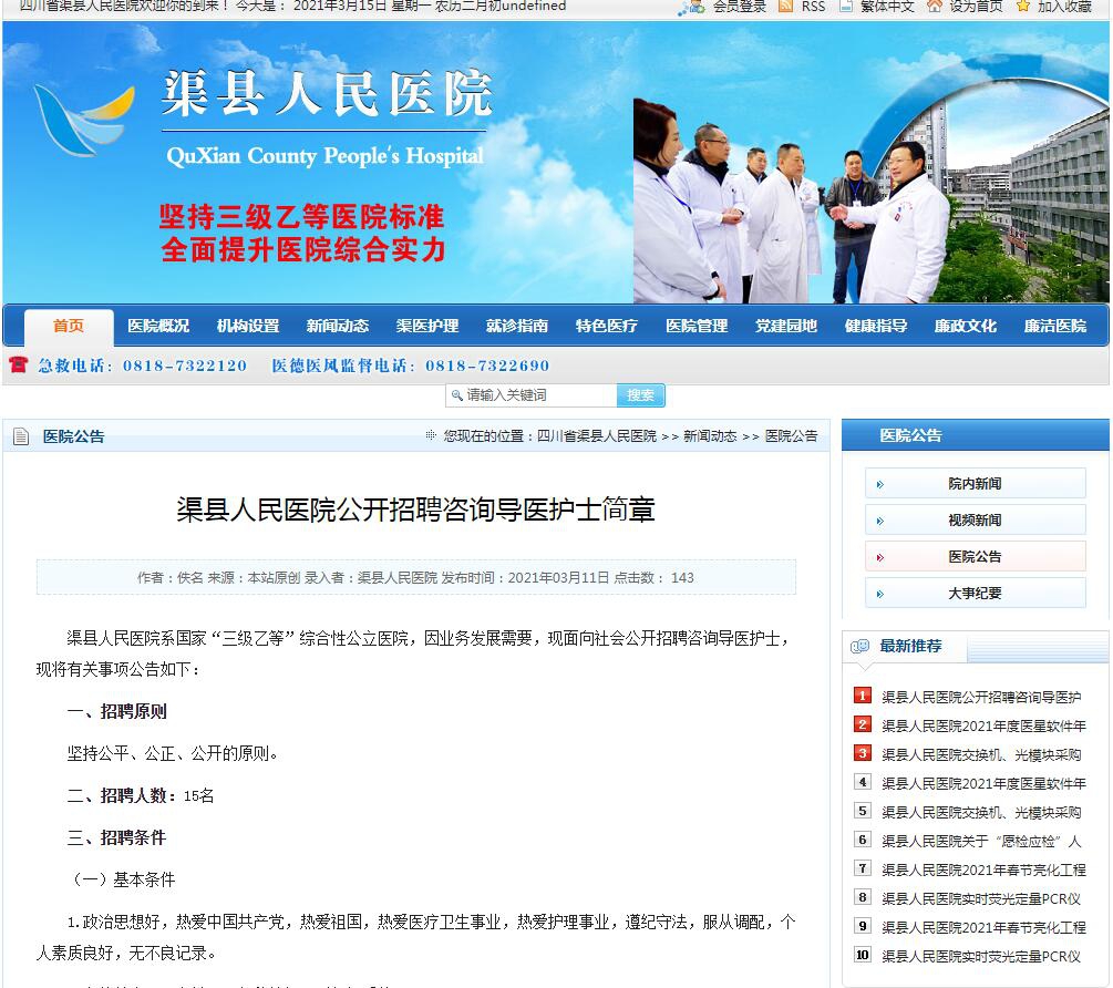 達聘網(wǎng)(www.0818rc.net)達州人才網(wǎng)訊,渠縣人民醫(yī)院系國家“三級乙等”綜合性公立醫(yī)院,因業(yè)務發(fā)展需要,現(xiàn)面向社會公開招聘咨詢導醫(yī)護士,現(xiàn)將有關(guān)事項公告如下:
